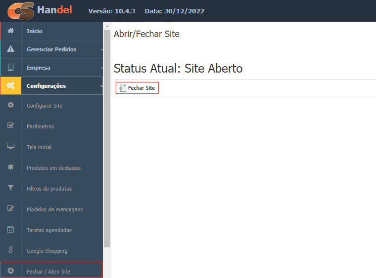 Utilize o botão "Fecha Site" para colocar o site em manutenção;