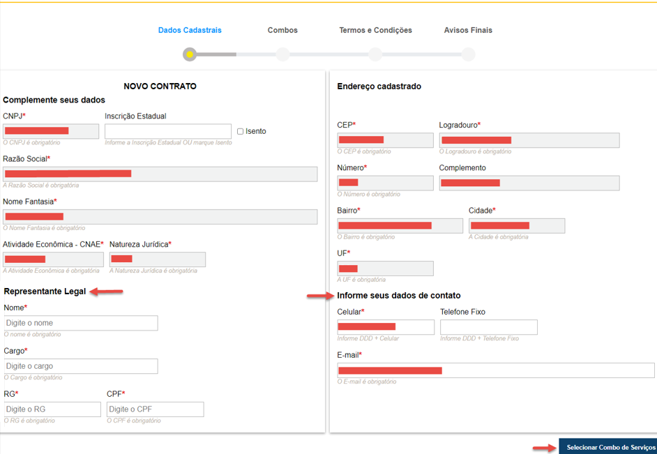 Ao finalizar o preenchimento clique no botão 'Selecionar Combo de Serviços'.