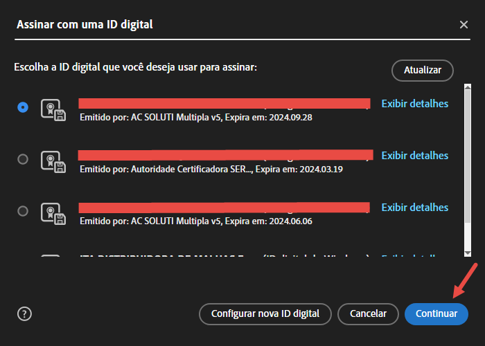 Uma nova janela será exibida para adicionar o certificado digital. faça a sua seleção e clique no botão 'Continuar', conforme demonstrado na imagem abaixo: