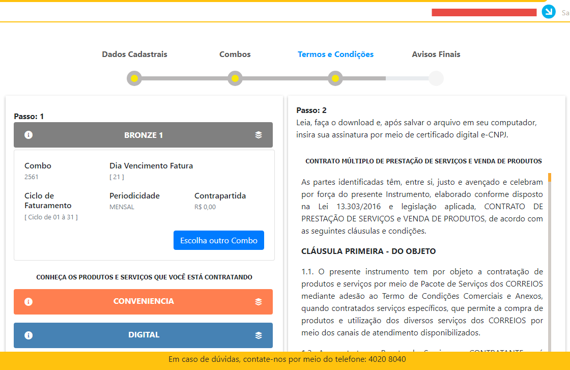 - Após confirmar a seleção do combo, a janela de 'Termos e Condições' será exibida.