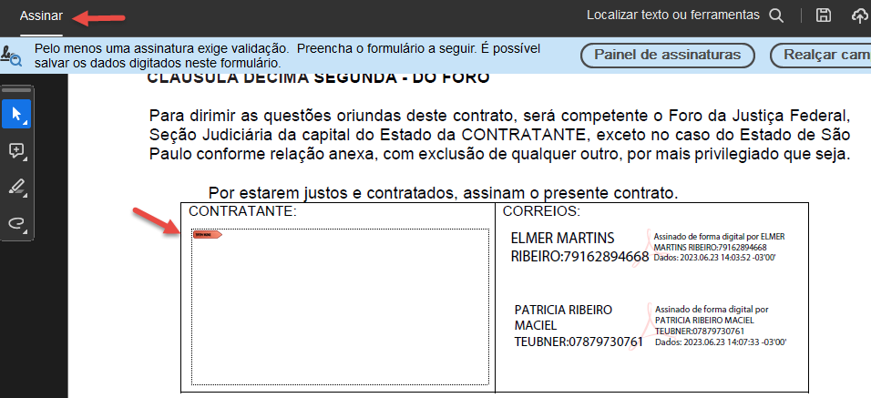 - Abra o contrato que você baixou anteriormente utilizando o Adobe Reader, que foi instalado no passo (5). Navegue até o final do documento e encontre o campo de assinatura. Clique em 'Assinar', como exemplificado na imagem a seguir: