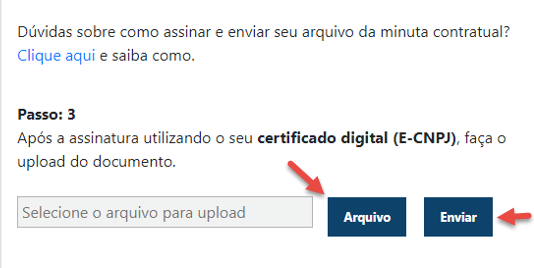 - Volte para a página dos Correios, clique no botão 'Arquivo', selecione o contrato já assinado e, em seguida, clique no botão 'Enviar', seguindo a imagem de referência abaixo:
