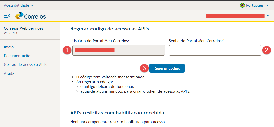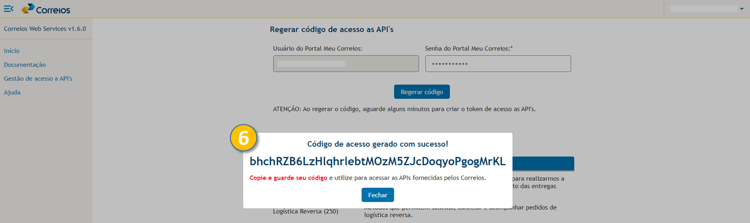 Será exibida a tela de 'Regerar código de acesso a API's', siga as orientações abaixo: