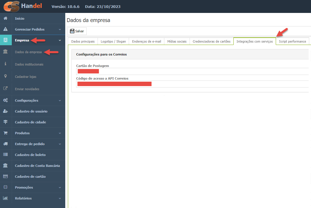 Complete as informações relacionadas ao cartão de postagem e ao código de acesso à API dos Correios. Em seguida, clique no botão "Salvar".