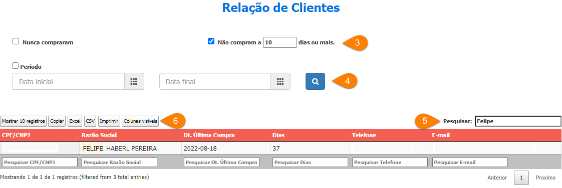 - Utilize os parâmetros de pesquisa para clientes que "nunca compraram" ou "não compram a 10 dias ou mais" por exemplo;