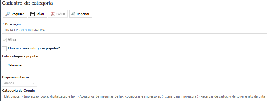 3. No cadastro de categoria, localize o campo 'Categoria do Google'. Clique nesse campo e digite a categoria desejada, conforme disponibilizado pelo próprio Google. Utilizamos a categoria referente à impressão, conforme ilustrado na imagem abaixo: