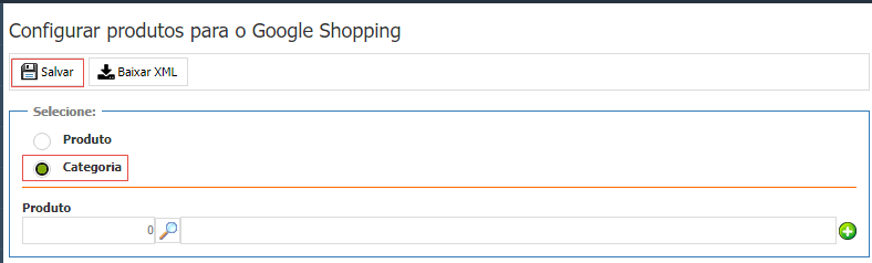 4. Com a categoria configurada, acesse os menus Configurações > Google Shopping. Você pode configurar os itens para o Google Shopping de duas maneiras: por produto ou por categoria. Primeiramente, demonstraremos como configurar por categoria. Selecione a opção Categoria e clique no botão [Salvar], conforme ilustrado na imagem abaixo: