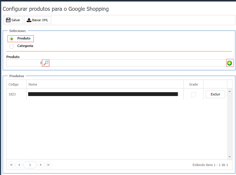 5. A mesma regra se aplica à configuração por produto. Selecione a opção Produto e adicione os itens individualmente que deseja publicar no Google Shopping, conforme ilustrado na imagem abaixo: