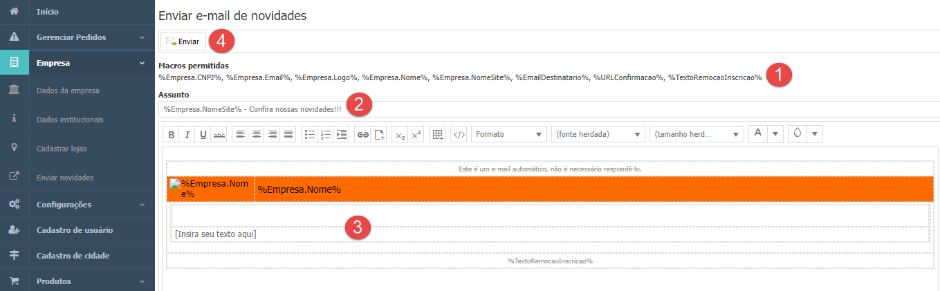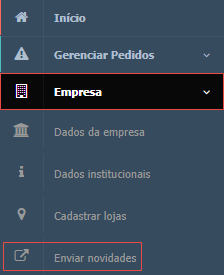 - Acesse o painel administrativo do site, por exemplo: digite a URL em seu navegador de internet administrativo.seudominio.com.br, acesse o menu lateral esquerdo, opção Empresa | Enviar novidades;